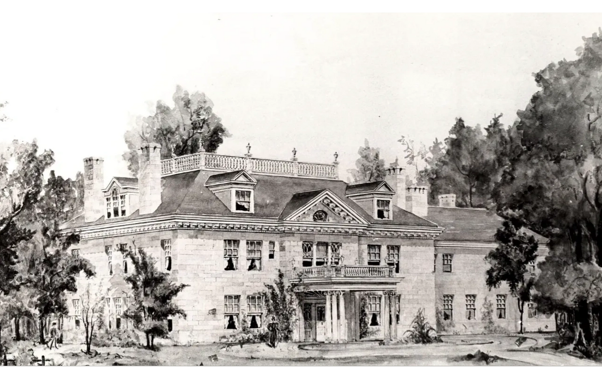 The 15,000 square foot, 30 room mansion includes a hand-carved paneled living room, 8 bedrooms with ensuite baths,